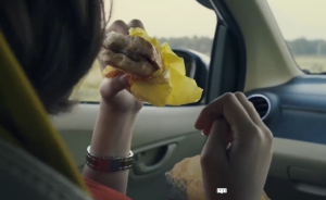 Gambar 1. Dinda mengonsumsi burger saat perjalanan dari Jakarta menuju Yogyakarta (Film Natalan, 17:21)