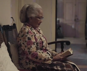 Gambar 2. Ibu Resnu Berpakaian Kebaya Jawa dan Membaca Alkitab (Film Natalan, 2015: 22.08)